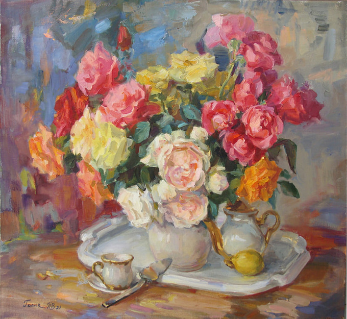 Painting still lifes with bouquets of flowers: poppies, daisies, chrysanthemums, lilacs. Still lifes with household items. Works done in oil and acrylic on canvas, pastel and gouache on paper.